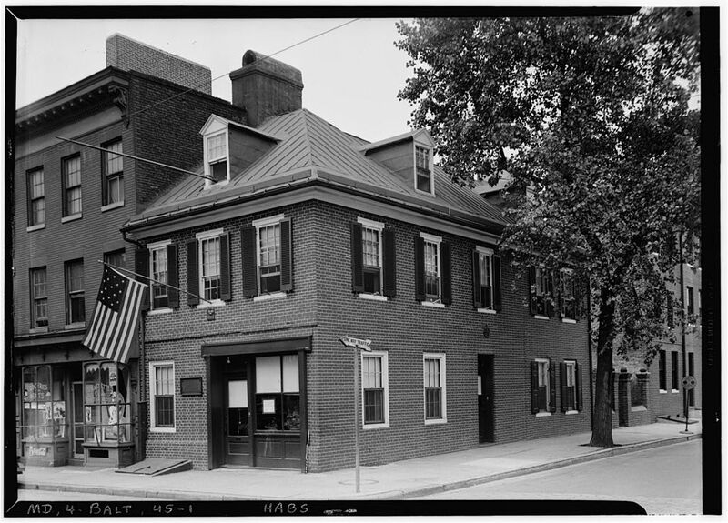 Exterior photograph of the Flag House at 844 East Pratt & Albemarle Streets, Baltimore, MD. Also known as the Mary Young Pickersgill House; associated with the Star-Spangled Banner. Surveyed as part of the Historic American Buildings Survey.