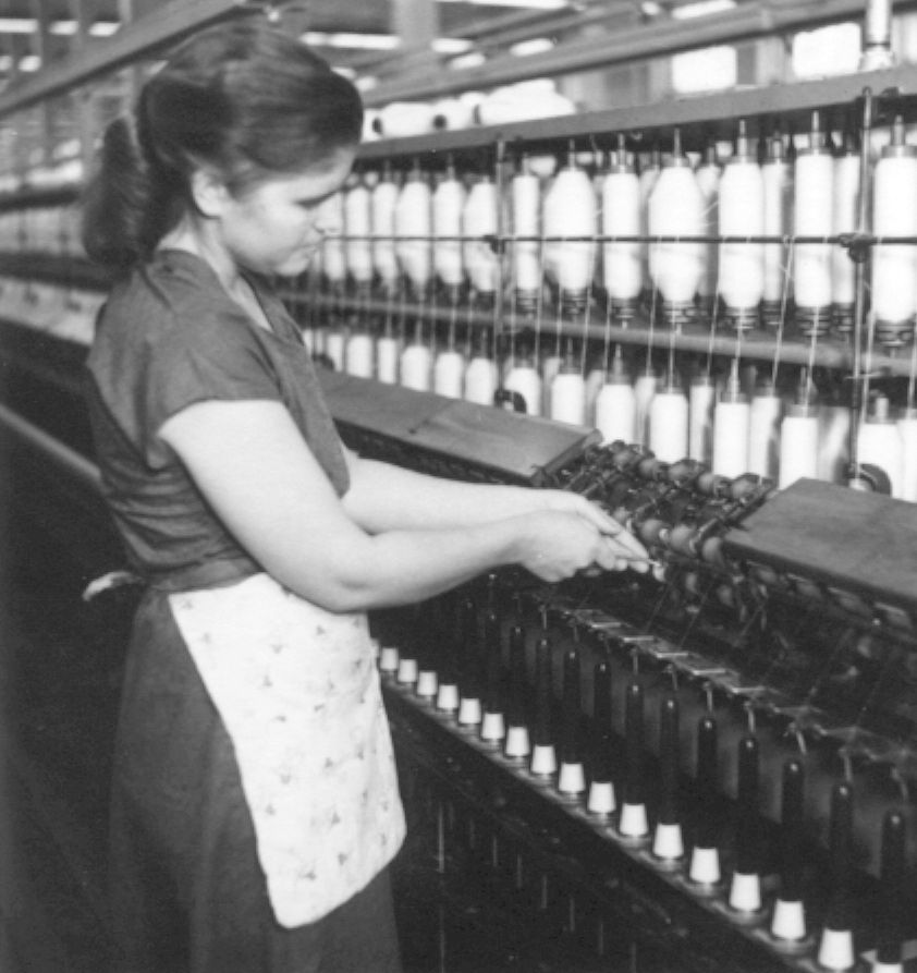 Worker operating a spinning frame; Spinning frame; Textile workers; Occupational safety; American Thread Company